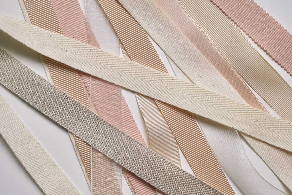 Trabajamos con todo tipo de tejidos como el satén doble cara, el grosgrain, organza, terciopelo… En fibras naturales y sintéticas que pueden ser orgánicas o recicladas. Además, si no encuentras el tejido que buscas en nuestro catálogo podemos desarrollar el que estás imaginando.